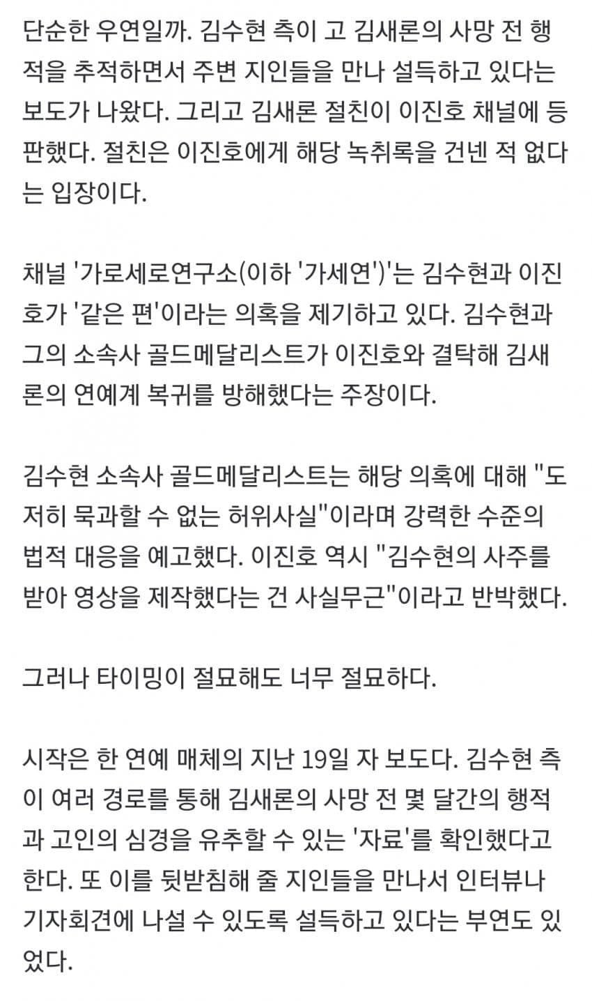 골드메달리스트 소속사는 김새론이 알바한 사실을 모른다고 이진호에게 말해서 이진호가 그걸 방송에 알렸고 김새론이 욕 먹은 후에 소속사는 김새론이 알바한게 사실이라고 했음