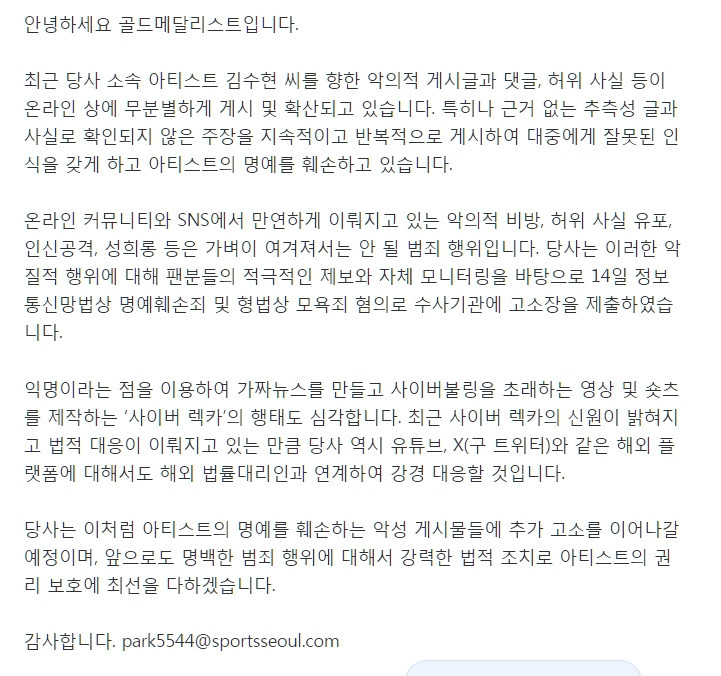 김수현 “악플러·사이버 레커 강경 대응... 고소장 제출”